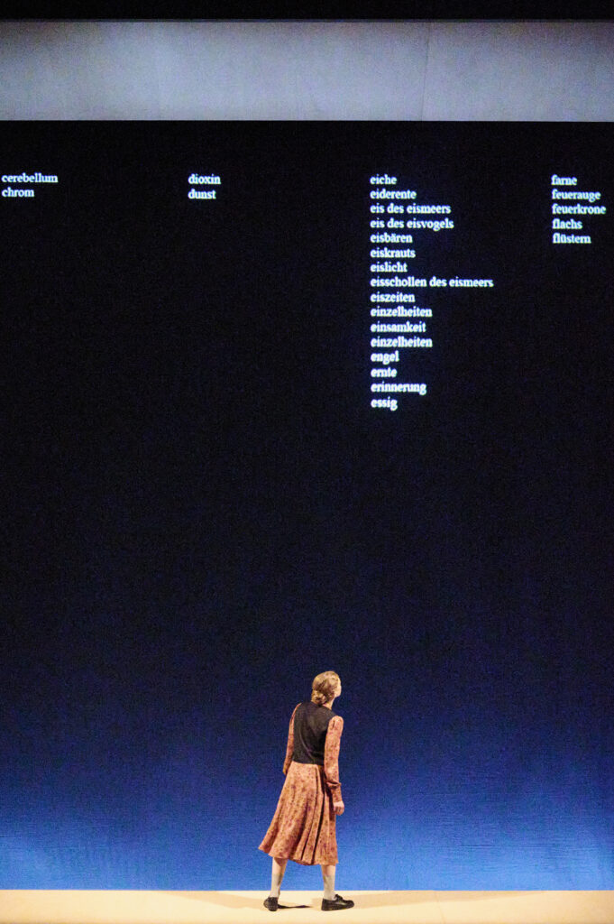 Das Ordnungsprinzip ist Spiel. Auf schwarze Gaze werden Begriffe in alphabetischer Reihenfolge projiziert, ein Schlag dagegen lässt sie durcheinander wirbeln, sich neu ordnen und andere Konstellationen entstehen. Die Bühne (Malte Knipping, Thom Luz) wechselt von einem Raum mit durcheinander gewürfelten Stühlen, über ein bespielbares Gittergerüst zu einem Café, dessen Inventar wie auch das Gerüst für Klangmöglichkeiten ausgelotet wird. Aus einem Tonbandgerät dringen Satzfetzen des dänischen Originals. Julia Wieninger dreht das Band zurück, spricht die deutsche Übersetzung, bemüht um Genauigkeit: „Aprikosenbäume – gibt es“. Durch das zarte Klavierspiel Ilse Ritters driftet das Strenge, Exakte dieser Worte ins Wehmütige. Wie eingefroren steht Alberta von Poelnitz auf einer Leiter, die zu einem offenen Quadrat führt. Dort wischen die drei Perkussionisten Stefan Krause, Ling Zhang und der musikalische Leiter Peter Conradin Zumthor mit Kreide rhythmisch an Tafeln, es klingt wie Regen. Mehr als nur zu dessen Untermalung dient die Perkussion an diesem Abend der Reaktion auf den Text. Statt Instrumente (mit Ausnahme des Klaviers) werden Alltagsgegenstände wie Metallstäbe oder Handbesen verwendet, Dinge also, die sich direkt aus dem Bühnenbild ergeben. Sie verstärken die Musikalität des Textes und lassen das Publikum eintauchen in einen entschleunigten, nachdenklichen, wunderbaren Kosmos. Kein leicht zu konsumierender, aber ein besonderer Abend, den man sich in diesen Zeiten gönnen sollte.