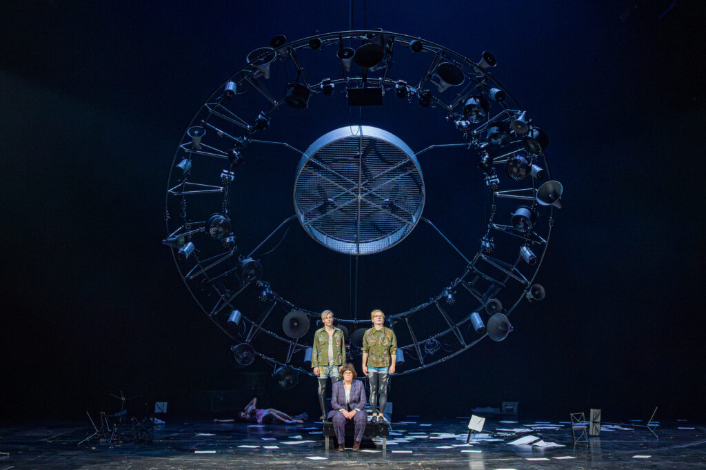 Sie fassen sich an den Händen, als sie noch bei vollem Saallicht die Bühne betreten. Zwei blonde Jungs in blauen Shirts, die Hosen gehalten von Hosenträgern (Kostüme: Nina von Mechow). Schüchtern, ein bisschen unsicher blicken sie in die Menge, bevor sie eilig zu unterschiedlichen Seiten abgehen. Nils Kahnwald und Kristof Van Boven spielen die namenlosen Zwillingsbrüder in Karin Henkels Inszenierung von „Das große Heft“, basierend auf dem Roman von Ágota Kristóf, und sie wirken in ihren Bewegungen, ihren Blicken, im Nesteln an der Kleidung, im einander bestätigendem Nicken tatsächlich wie Zehnjährige. Von ihrer Mutter (überirdisch schön in gelbem Kleid: die Tänzerin Sabine Molenaar, alternierend mit Maria Carolina Vieira) sind sie zur Großmutter aufs Land gebracht worden, denn es ist Krieg. Dröhnend erhebt sich ein gewaltiger Stahlkranz mit Lautsprechern und gleißenden Scheinwerfern (Bühne: Katrin Brack). Vorne stehen die Zwillinge und berichten aus ihrer Perspektive von den Ereignissen, die sie in einem großen Heft notieren. Das Erzählte, sagen sie, soll „wahr sein“. Deshalb verwenden sie keine wertenden Begriffe, bleiben so sachlich wie möglich. „Wir misstrauen den Worten“, sagen sie und bleiben ausschließlich beim „Wir“. Das schweißt sie zusammen und hilft ihnen, die furchtbare Zeit zu überstehen. Denn ihnen wird nichts geschenkt. Die Großmutter, die im Dorf nur „die Hexe“ heißt, kennt weder Zuneigung noch Empathie. Ihre Enkelkinder nennt sie „Hurensöhne“ oder „Hundesöhne“, lässt sie schuften, auf dem Boden schlafen und schlägt sie, wenn ihr danach zumute ist. Die Dorfkinder ärgern und schikanieren sie ebenfalls, so dass die Jungen beschließen, sich durch Training eine harte Schale zuzulegen: Sie beschimpfen und schlagen sich gegenseitig, sie stehlen, sie töten, sie hungern und harren in der Kälte aus. Ein Satz wie „Es tut nicht weh“ soll helfen, Schmerzen nicht mehr zu fühlen, und wer häufig genug „Wir weinen nicht mehr“ sagt, wird irgendwann keine Träne mehr vergießen.