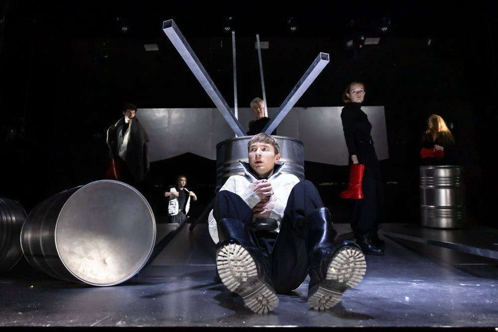 Eine glückliche Entscheidung von Regisseur Kai Hufnagel ist, jede Art von Realismus zu vermeiden. Statt dessen wählt er die Abstraktion und öffnet damit die Geschichte über den historischen Rahmen hinaus ins Heute. Lars Peter hat ihm dafür eine Bühne gebaut, die mit Fässern, Stangen und Boden fast ausschließlich aus Metall besteht. Mit ein paar Handgriffen werden die Stangen zu Gewehrläufen, mit roten Gummistiefeln und rotem Helm verwandeln sie sich in einen toten Soldaten. Die Schauspieler:innen, von Hufnagel an beide Seiten der Bühne gesetzt, so dass sie je nach Szene auf- und abtreten können, tragen Ringe an den Händen, mit denen sie auf das Metall schlagen und kriegsähnliche Geräusche erzeugen können. Ihre schwarzen Grundkostüme werden mit hellen Oberteilen zu Uniformen umgewandelt. (Kostüme: Sarah Yekani Zare). Mit weißen Stoffbahnen verwandelt sich die Bühne in eine Schneelandschaft, deren Kälte bis in die Zuschauerreihen zu spüren ist. So weit so sinnvoll. Und doch bleibt dieser Abend seltsam leer, die Geschichte nimmt einen nicht mit. So bleiben Bruchstücke hängen, die sich jedoch nicht zu einem flüssigen Ganzen entwickeln. Es ist eben wirklich nicht einfach, so einen Roman auf gut zwei Stunden (inkl. Pause) einzudampfen und eine nachvollziehbare Handlung zu erzählen.
