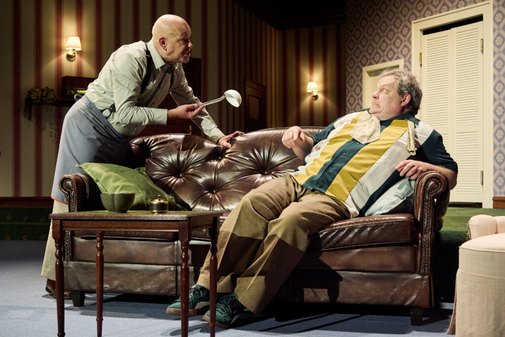 Lennart Matthiesens Inszenierung nimmt sich Zeit für diese Anfangsszene. Indem er das schweigende Warten und das Kartenmischen ausspielen lässt, werden die Charaktere innerhalb der Männerrunde deutlich und eine untergründige Spannung aufgebaut. Neil Simons Komödie „Ein seltsames Paar“ hatte 1965 am Broadway Premiere und wurde ein Riesenerfolg, vor allem durch die Verfilmung mit Walter Matthau und Jack Lemon vier Jahre später. Matthiesen lässt hinsichtlich der Ausstattung die Sechziger Jahre wieder auferstehen: Jordans Murray und Tölles Vinnie tragen üppige Frisuren, unter ihren Hemden könnte man unkontrollierte Brustbehaarung vermuten. Lange Locken auch bei Cecily (Dagmar Bernhard), die später mit ihrer Schwester Gwendolyn (Julia Weden) bei Oscar auftaucht, beide in Patchwork-Hosenanzügen (Kostüme: Heike Engelbert). Oscars Wohnzimmer ist wenig liebevoll möbliert, eine quer durch den Raum gespannte Wäscheleine signalisiert, dass hier jemand wenig Wert auf Schöner Wohnen legt (Bühne: Ulrich Frommhold). Ist aber auch kein Wunder. Oscar ist schon seit einiger Zeit von Blanche geschieden und lebt jetzt drauflos, ohne sich um Äußerlichkeiten zu kümmern. Bähnk ist dafür die Idealbesetzung: laut, immer ein bisschen daneben mit wenig sensiblen Bemerkungen, trinkfreudig und treffsicher, was die Anzahl der Fettnäpfchen betrifft, aber eben auch gutherzig. Natürlich lässt er seinen Freund Felix (Harald Weiler) nicht hängen, der nach der Trennung maximal verzweifelt ist. Er überredet ihn, erst einmal bei ihm einzuziehen, schließlich sei die Wohnung ja groß genug. Und damit beginnt der Stress, denn anders als Bähnks Oscar ist Weilers Felix penibel, putzfreudig und hat einen Hang zur Weinerlichkeit und Hypochondrie. Dass es in dieser Wohngemeinschaft zu – für das Publikum sehr lustigen – Spannungen kommt, versteht sich daher von selbst. Eine unvorhergesehene Wendung ergibt sich durch den Besuch der beiden Schwestern, allerdings erst nach der Pause des zweistündigen Abends (inklusive Pause).