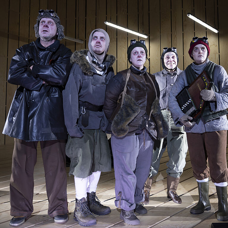 Zu sehen ist erste einmal: Nichts. Ein Sirren, Knacken und Knarren ist zu hören, dann hebt sich langsam der Eiserne Vorhang im Ernst Deutsch Theater. Fünf in Stiefel, dicke Jacken und Mützen gekleidete Figuren mit Schutzbrillen (Kostüme: Amelie Müller) stieren ins Publikum oder versuchen durch den Spalt in den Bretterwänden (Bühne: Antonia Kamp) einen Blick nach draußen zu erhaschen. Dort gibt es vielleicht irgendeine Möglichkeit zur Weiterfahrt mit diesem Expeditionsschiff, das eingeschlossen ist von Eis, im „undurchdringbaren Weiß“. Sie schniefen, schlagen wegen der Kälte die Arme um den Körper, und es dauert eine kleine Ewigkeit, bis jemand das Wort ergreift und feststellt: „Wie langsam doch die Zeit vergeht“.