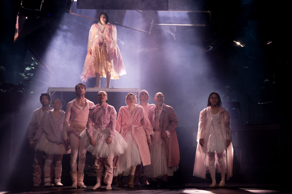 Ganz allein mitten im Lichtkegel steht Billy (Nimuë Walraven) und singt davon, dass es doch irgend etwas Schönes geben müsse in einer Welt ohne Gott. Dass sie sich nach Umarmung sehnt. Ihr wunderbar klarer Gesang ist der berührende Beginn der Uraufführung von „Hope“, und man ahnt, dass es mit der Hoffnung nicht besonders weit her ist in dieser Welt. Dann kippt der Moment. Mit einem Schlag flutet grelles Licht die Bühne, die Illusion wird gebrochen. Unter der Leitung der Choreografin (Maike Knirsch) stellen sich Billy und ihre Kolleg:innen aus dem Tanzensemble mit einem fröhlichen „Hallo!“ dem Publikum vor, jede und jeder darf kurz etwas zur eigenen Biografie sagen. Hinter ihnen sind hängende Spiegel, spiegelnde fahrbare Podeste in Keilform und bewegliche Stahlgerüste zu sehen, auf denen die Musiker (Hanna Caroline Boos, Camill Jammal und Matze Pröllochs alternierend mit Timon Schempp) platziert sind (Bühne: Ascon de Nijs). Die Tanztruppe, erfahren wir, hat gerade eine Probe beendet und will jetzt noch kurz bei einem Getränk, offeriert in sehr eleganten Kelchen von der sehr eleganten Bardame (Bien de Moor), entspannen. Sie tragen noch ihre rosafarbenen Tütüs (Kostüme: MAISON the FAUX und Simon Carle), sind also noch mit einem Bein in der Arbeit. Da platzt plötzlich Ensemblesprecher Nick (Patrick Bimazubute) mit der Neuigkeit herein, dass die Chefin das gesamte Stück zu Gunsten einer Solistin geändert hat. Abgesprochen hat sie es mit niemandem, sie allein hat entschieden, weil sie als Leiterin die Macht hat.