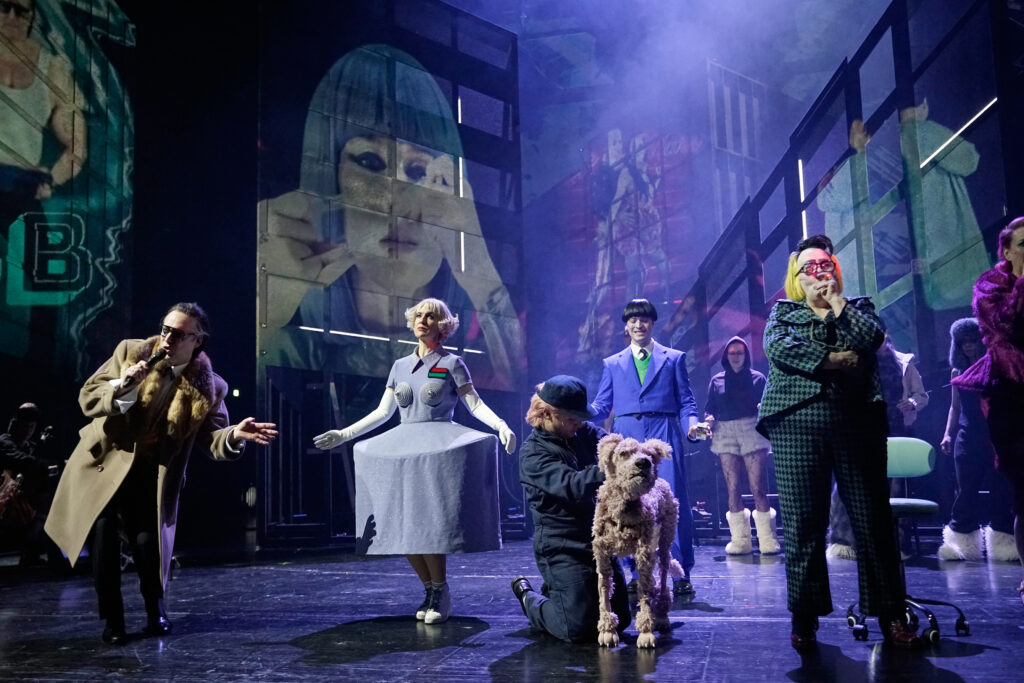 Claudia Bauers Inszenierung führt mit diesem Intro tief ein in die feindlich-kalte Welt von „Hundeherz“ , einem Stück von Armin Petras nach der 1925 erschienenen Novelle von Michail Bulgakow. Darin taucht ein räudiger Hund in Gotham City auf, einer fiktiven Stadt der Zukunft, bekannt vor allem durch den Superhelden Batman. Aber der ist leider nirgends zu sehen. Das Comic-hafte, das mit der Figur verbunden ist, übernimmt Bauer aber bereitwillig. Sie überdreht Handlung und Spiel der Figuren, lässt keine oder kaum Zwischentöne zu. In einer Flut aus schrillem Spiel, aufwändig-bunten Kostümen (Vanessa Rust), fantastischen Videos (Sébastien Dupouey) und den beeindruckenden Gesängen eines fünfköpfigen Chores (Komposition: Peer Baierlein) geht ihr der Fokus verloren.