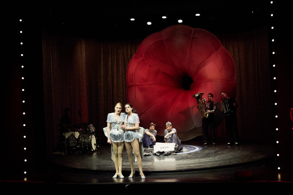 Ein riesiger Grammophontrichter (auch Projektionsfläche für die Schwarzweiß-Videos von Ingo Putz) dominiert die Drehbühne, die ihrerseits einen Plattenteller mit Schellackplatte darstellt (Bühne und Kostüme: Yvonne Marcour). Es ist die Welt der beiden Brüder, die mit atemberaubender Geschwindigkeit erst Hamburg an 364 Tagen im Jahr begeistern, später ganz Deutschland, Dänemark und Schweden. Mitreißende Couplets singen sie, Jannik Nowak als immer etwas besorgterer Bruder Ludwig und Stephan Möller-Titel als bärbeißiger, äußerst selbstbewusster Leopold (später als sein Sohn James Iwan). Ihnen kann offenbar nichts und niemand etwas. Das Hochfahrende, Erfolgreiche zerfällt in dem Moment, als Leopold auf der Bühne zusammenbricht und stirbt. Putz setzt damit gegen den launigen, schmissigen Ton das Ernsthafte, Bedrohliche als ständigen, oft aber unbemerkten Begleiter. Still singt Möller-Titels Ludwig, nunmehr auch vom Kostüm her unverkennbarer Jude, am Bühnenrand „Im Himmel ist herrlich“, während der Rest der Trauergäste den Sarg des Bruders trägt. Aber schon ein weißer Lilienstrauß macht wieder Hoffnung, Leopolds Sohn James springt als neuer Partner ein. Die Erfolgsgeschichte wird fortgesetzt, ja sogar das Operettenhaus am Spielbudenplatz gekauft. Bis geflüstert wird, bis die Nazis kommen.