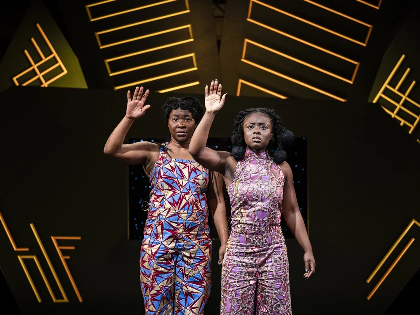 Die Bühne (Dennis Stoecker) hat ein bisschen was von Raumpatrouille, der deutschen Erfolgsserie aus den 1960er Jahren: an den Rändern pyramidenartige Kegel, zwei weiße, futuristisch anmutende Sessel, im Hintergrund ein Bildschirm. Das Ganze steht auf einem erhöhten Boden, unter dem Nebel hervorquillt und Lichter blinken, sobald das Raumschiff startet. Denn um einen Flug ins All, genauer zum Planeten Keppler 160, geht es in „K(no)w Black Heroes“ im Thalia in der Gaußstraße. Essinam (Florence Adjidome alternierend mit Betty Paha) und Akos (Precious Wiesner) verlassen mit einem fröhlichen „Fuck you, Erde!“ unseren Planeten, denn dort scheinen ihnen zu viele alte weiße Männer das Sagen zu haben. Was sie mitnehmen und wie sie ihre Ankunft auf Keppler 160 gestalten wollen, davon erzählt der knapp 60minütige Abend.