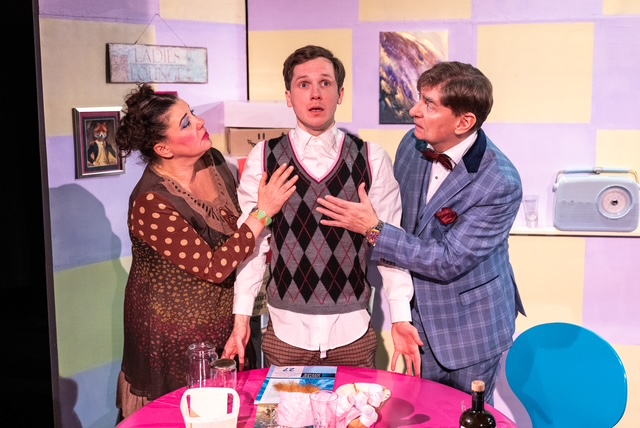 Temporeich und mit einem geschickt aufgebauten Spannungsbogen erzählt Sudhoff mit ihrem bestens aufgelegten Ensemble die Geschichte von Konrad. Johan Richter spielt ihn zunächst als einen auf „Kind“ programmierten Roboter: gezirkelte Bewegungen, maskenhaftes, ins Gesicht getackertes Grinsen, runde Augen und akkurate, auch die Endsilben berücksichtigende Sprechweise. Brav spult er ab, was ihm in der Fabrik und in den dortigen „Schuldgefühlsstunde“ eingetrichtert worden ist. „Sollte man“ und „sollte man nicht“ gehören zu seinem Standardvokabular. Damit ist er zwar das totale Gegenteil zu der lebensfrohen, jedwede Regel ignorierenden Berti, aber sie hat keine Probleme damit, diesem merkwürdigen Kind die – von der Fabrik im Begleitschreiben geforderte – Zuneigung zuteil werden zu lassen. Der biedere, auf Formen bedachte Apotheker Egon (Frank Roder) dagegen, findet so ein angepasstes Kerlchen natürlich perfekt und beansprucht gleich die Vaterschaft für sich. Klar, dass es zum Streit zwischen Berti und Egon über Erziehungsfragen kommt (dazu Konrad: „Eltern sollten sich eigentlich gut vertragen. Das ist besser für die Kinder.“). Irgendwann wird jedoch klar, dass Konrad an die falsche Adresse geliefert worden ist und an seine rechtmäßige Besitzerin überstellt werden soll. Aber Berti und Egon wollen Konrad behalten, ebenso die erfrischend unkonventionelle Nachbarstochter Kitty (Charlotte Durbass). „Außergewöhnliche Umstände erfordern außergewöhnliche Maßnahmen“, sagen sie sich und erziehen Konrad um: Aus dem angepassten KI-Kind wird ein rebellischer Junge mit Gefühlen, der auch bemerkenswert gut fluchen kann.