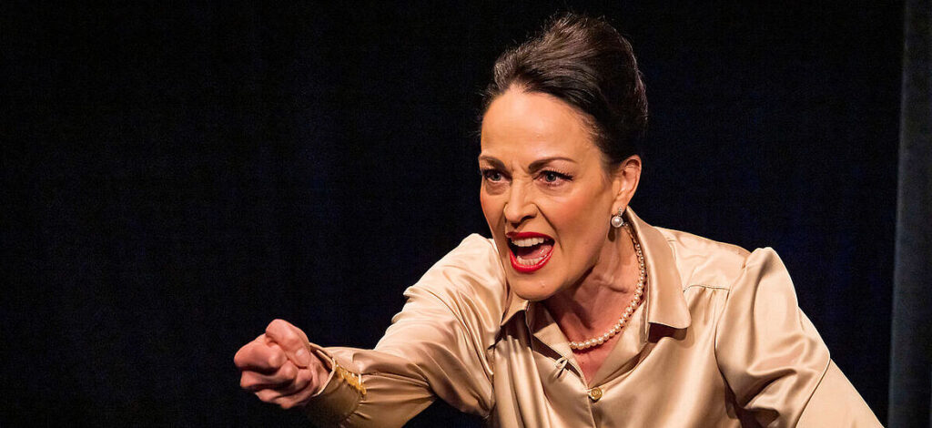 Die Callas lässt auf sich warten. Pünktlichkeit hat die alternde „Göttliche“, die „Primadonna assoluta“ auch jetzt nicht nötig. Sie steht zwar nicht mehr auf den Bühnen der berühmtesten Opernhäuser der Welt und gibt stattdessen aufstrebenden Gesangsstudierenden Unterricht, aber sie ist und bleibt ein Star. Also bittet ihr Pianist Emanuel Weinstock (Markus Jan Weber) das Publikum im Schmidtchen erst einmal um Geduld und überbrückt die Wartezeit am Piano mit fünf Hits aus der Opernwelt, die die Zuschauer*innen selbst auswählen dürfen. Ein entsprechender Flyer mit Vorschlägen liegt auf den Plätzen. Und dann rauscht sie herein. Glänzende Bluse, taillierte Hose, die Haare in strengem Knoten (Kostüme: Ricarda Lutz), zielsicherer Schritt. Annic-Barbara Fenske lässt schon bei ihrem ersten Auftritt keinen Zweifel, dass sie als Maria Callas den Raum dominiert. Das Sagen hat sie sowieso. Eine herrische Geste, ein direkter Blick ins Publikum und ihre Ansage „Kein Applaus!“ wird brav befolgt. Mit klirrender Freundlichkeit kommandiert sie ihren Pianisten herum, kann sich aber dessen Namen „unmöglich merken“, – er ist ja schließlich nicht auf Augenhöhe – und bittet dann „das erste Opfer“ herein.