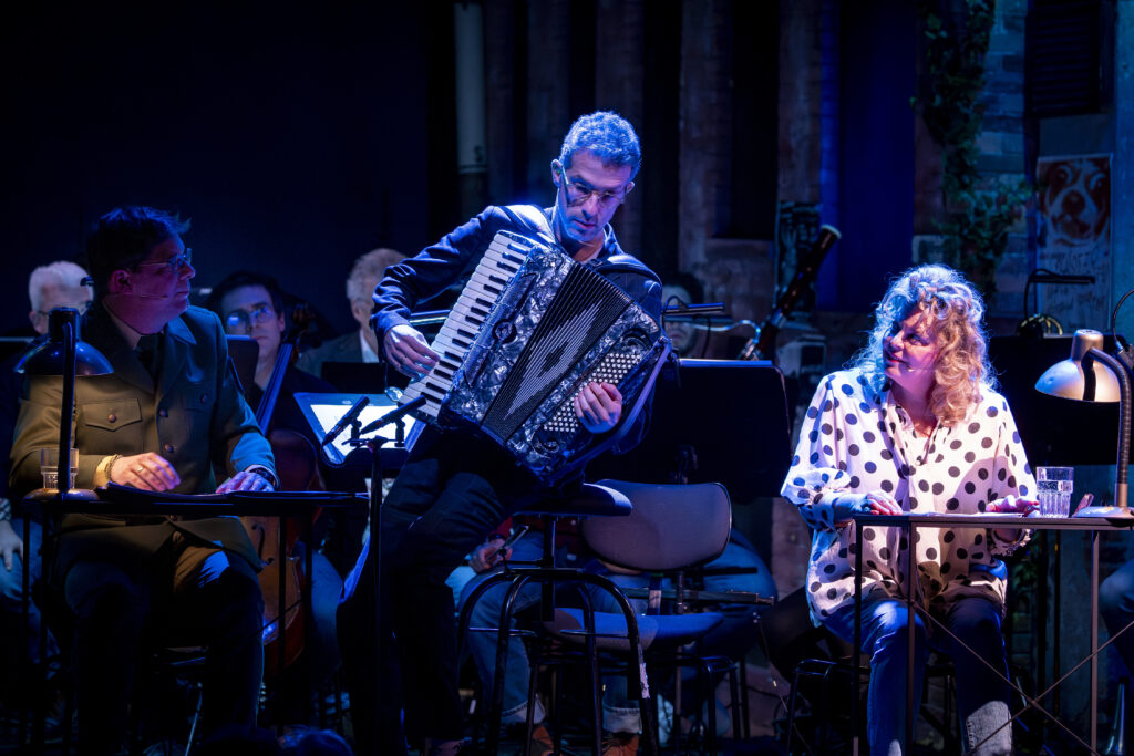 Omer Meir Wellber, Generalmusikdirektor und Chefdirigent der Hamburgischen Staatsoper, Martin Lingnau, künstlerischer Leiter der drei Schmidt-Bühnen, und der Journalist Axel Brüggemann haben aus Originaldokumenten und Zeugenaussagen Pinzners Geschichte destilliert und sie mit der Musik von Prokofjews „Peter und der Wolf“ verknüpft. Das auf 22 Musiker:innen reduzierte Philharmonische Orchester tritt ganz im Sinne des für diese Kooperation ausgegebenen Mottos „Frack off“ in privater Kleidung auf und ordnet sich im „Heiße-Ecke“-Bühnenbild ein. Rechts und links neben dem Dirigenten sitzen Brüggemann als Polizist und Carolin Spieß als Pinzners zweite Ehefrau Jutta. Der Dirigent hebt die Hände und – vom Band wird Santanas „Samba Pa Ti“ gespielt, das Lieblingslied der Pinzners, das bei ihrer Beerdigung gespielt werden sollte. „Mensch Mucki, den Himmel gibt es gar nicht, wenn man tot ist. Und wenn man lebt, auch nicht“, stellt Carolin Spieß als Jutta erstaunt und desillusioniert fest.